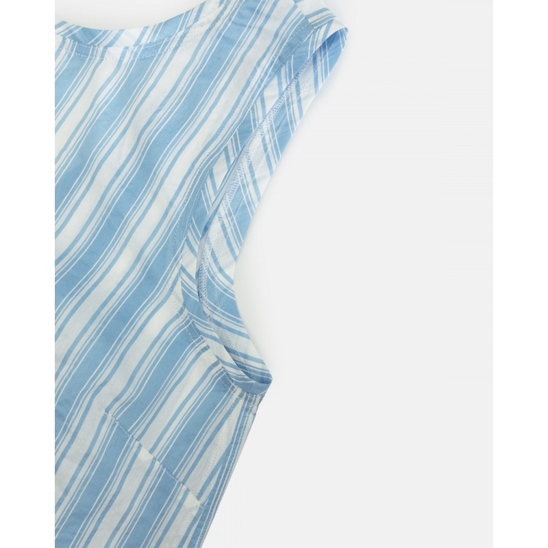 Top senza maniche sartoriale in cotone e seta deadstock a righe bianco e celeste. Profondo scollo rotondo sulla schiena e dettaglio del logo, emblema del brand, in metallo dorato. Spacchi laterali e pinces sul seno, per dare vestibilità sul petto e sui fianchi.