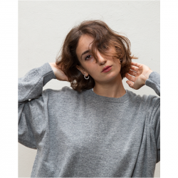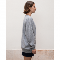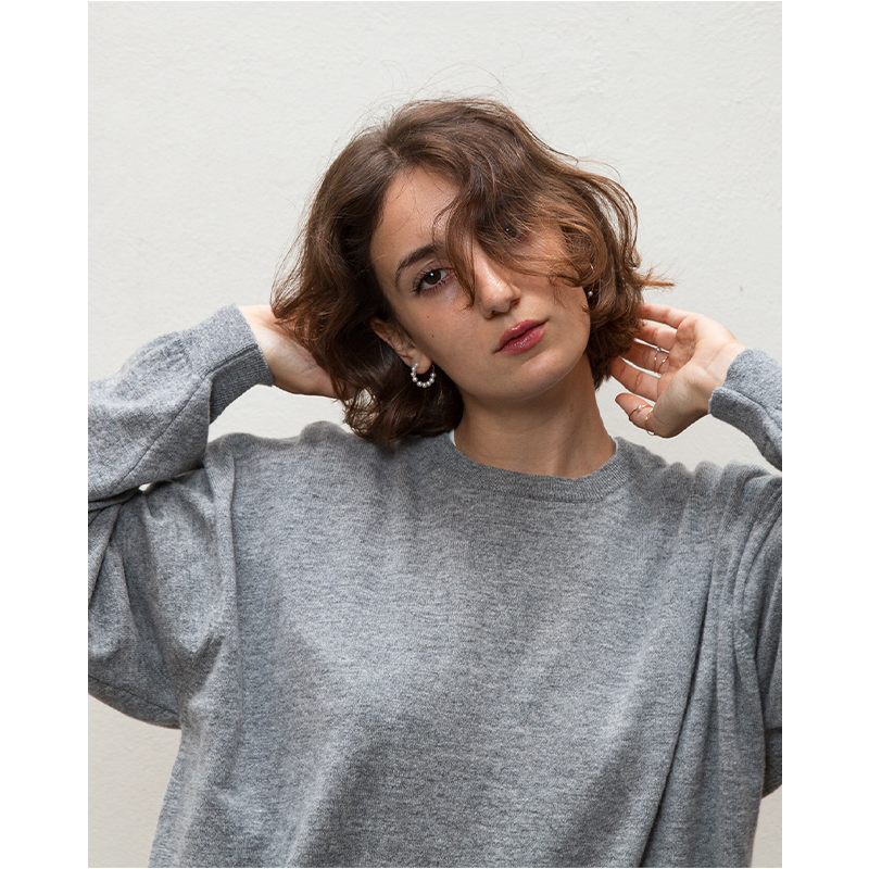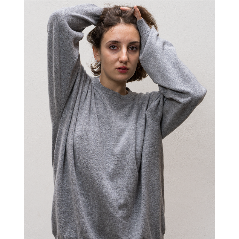 Il modello è girocollo, taglia unica e con spalla scesa. Ha una vestibilità ampia e rilassata, pensata per adattarsi a diverse fisicità senza stringere.