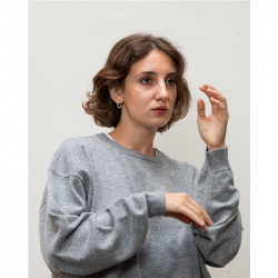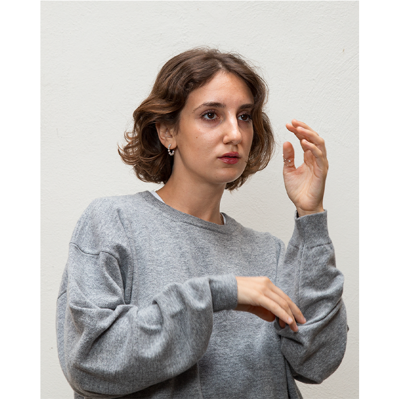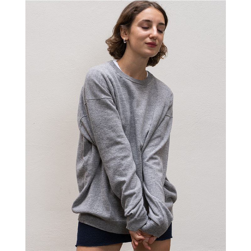 Il modello è girocollo, taglia unica e con spalla scesa. Ha una vestibilità ampia e rilassata, pensata per adattarsi a diverse fisicità senza stringere.