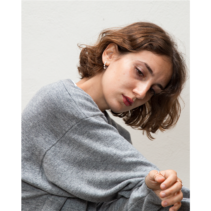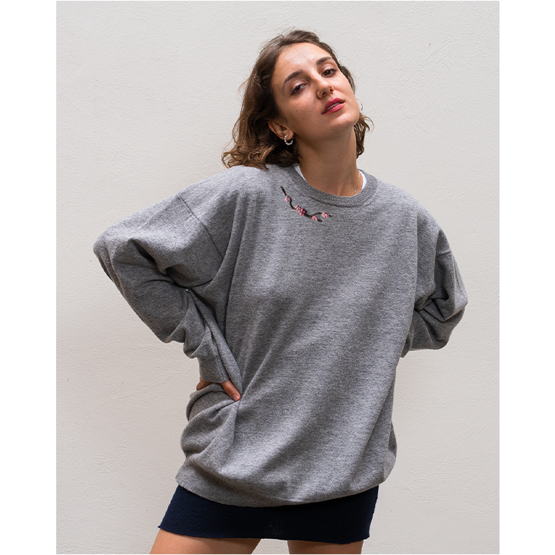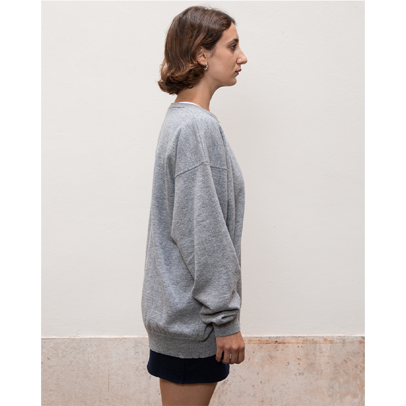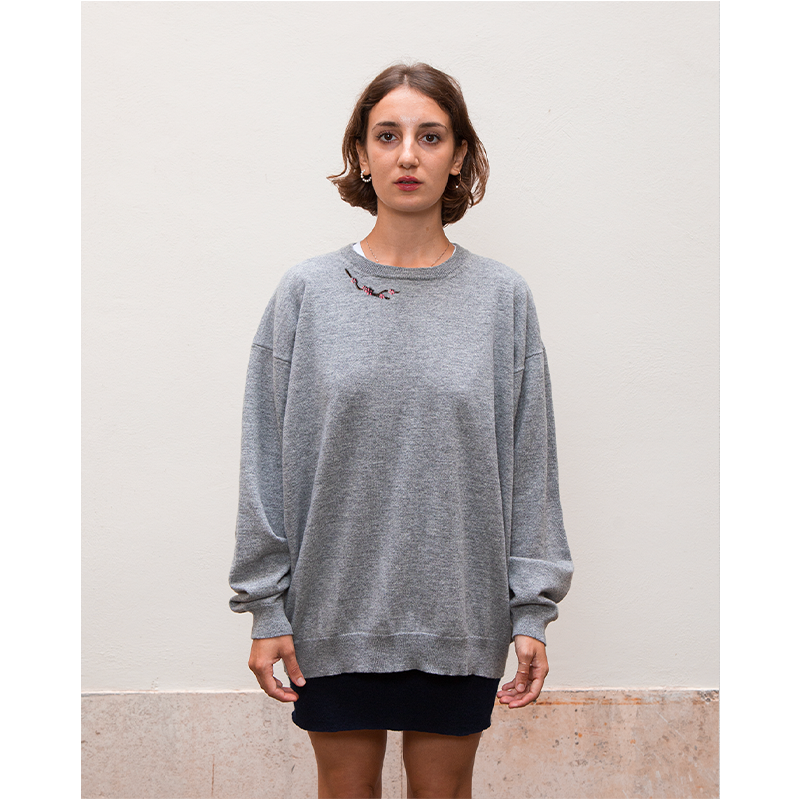 Il modello è girocollo, taglia unica e con spalla scesa. Ha una vestibilità ampia e rilassata, pensata per adattarsi a diverse fisicità senza stringere.