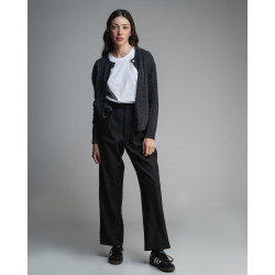 Pantaloni realizzati in 100% lana con dettagli in viscosa provenienti da economia circolare. Chiusura invisibile con bottoni in madreperla, tasche laterale e sul retro, pinces e gamba ampia. Rifiniti in modo maniacale per darti una perfetta vestibilità ed eleganza.