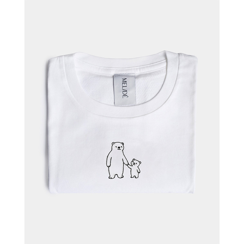 Un orso grande e uno piccolo che si tengono per mano, un ricamo eseguito a mano che parla di guida, di presenza, di qualcuno che sta accanto mentre cresci.