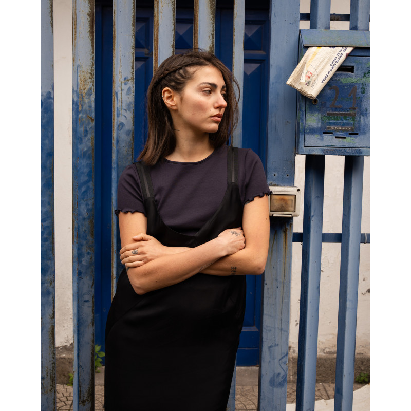 Questo top sartoriale, realizzato in Italia, unisce linee minimaliste e influenze anni ’90, distinguendosi per l’orlo smerlato e le maniche ad aletta e il tessuto deadstock a costine in 94% cotone e 6% elastan.