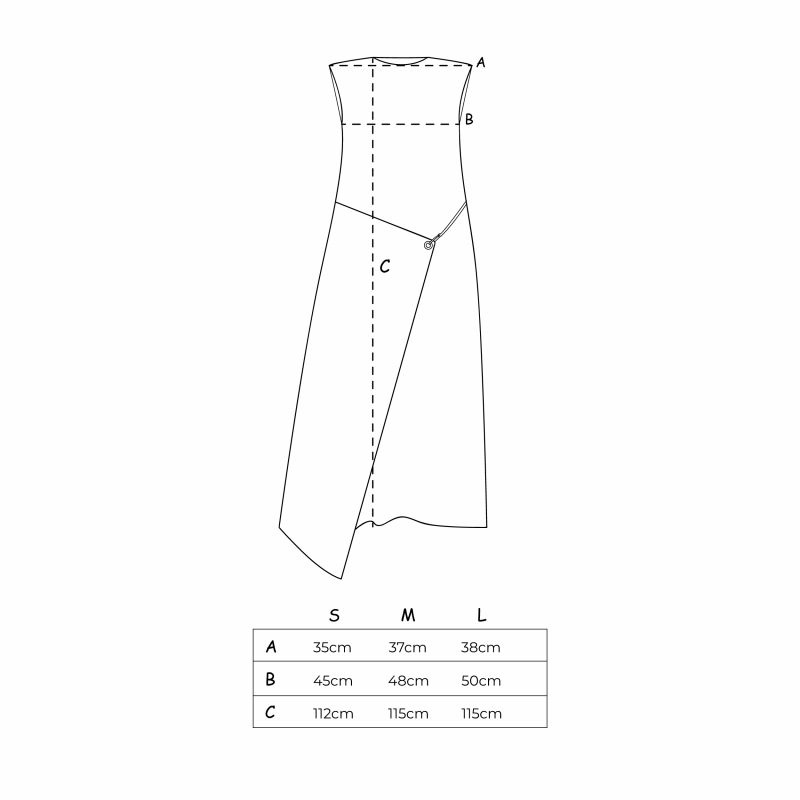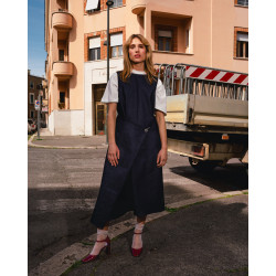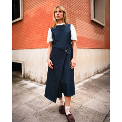 Vestito con scollo rotondo, lunghezza midi, pannello e chiusura con moschettone realizzato in jeans proveniente da economia circolare.