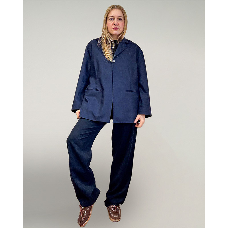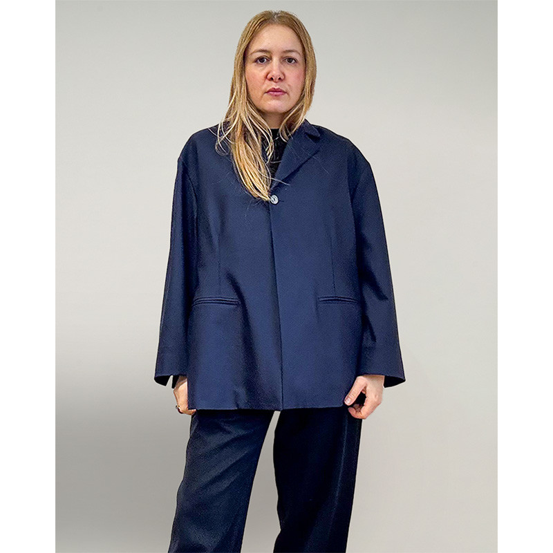 Giacca taglia unica oversize, dal disegno squadrato e dritto, essenziale e senza tempo. La costruzione è pensata per essere indossata con naturalezza, anche sopra capi voluminosi, mantenendo una linea pulita e mai appesantita.