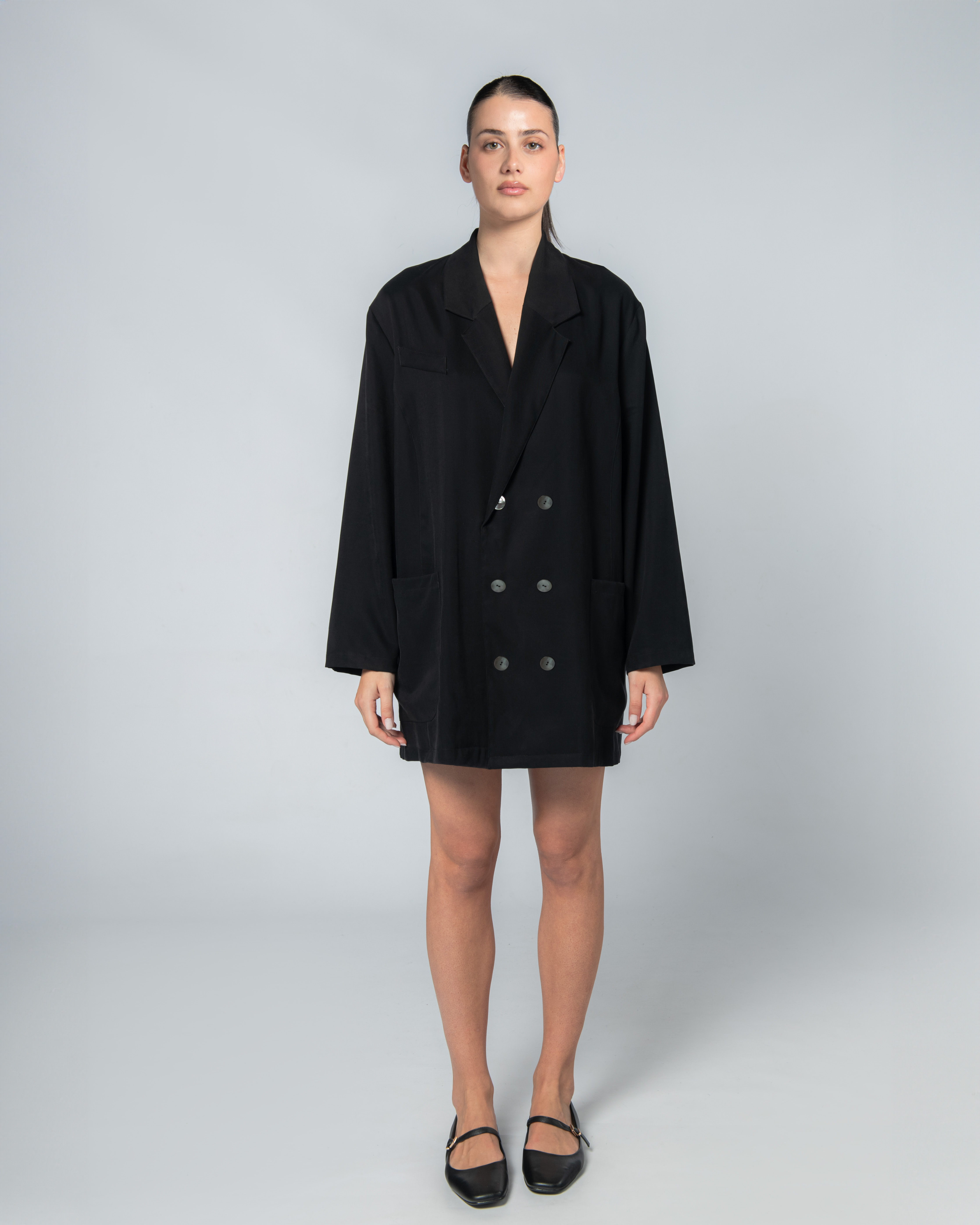 Ma la sorpresa è che lui, il nostro Blaze-à-Porter può anche essere un vestito (o se vogliamo essere più cool - e vogliamo esserlo, perché no? - un blazer-dress). Completamente allacciato diventa un capo che fonde la struttura sartoriale tipica di una giacca con la linea e la lunghezza tipiche di un abito corto.