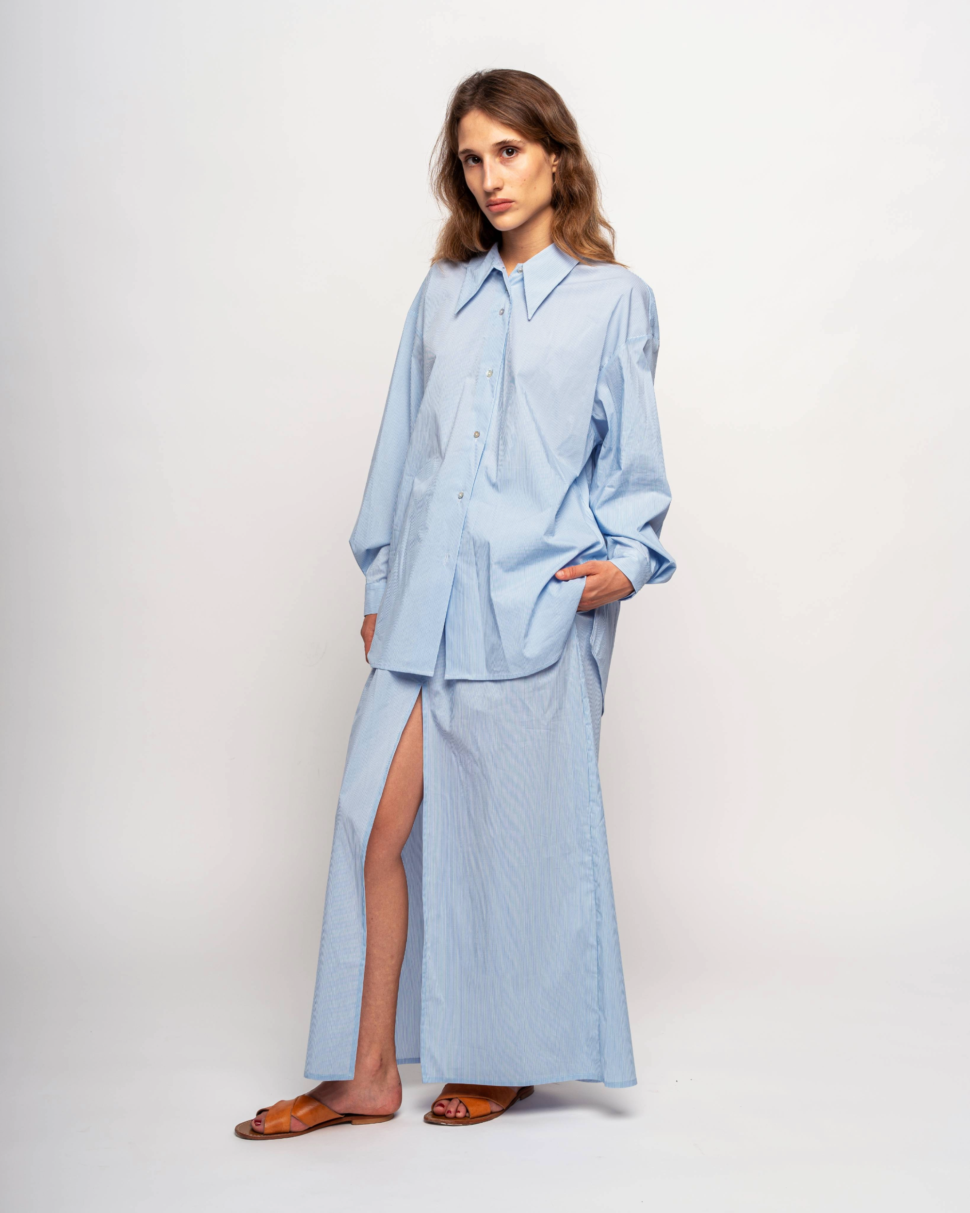 Iniziamo con il completo gonna e camicia a righe sottili azzurro e bianco. Se vi immaginate vestite così mentre fluttuate sul vostro terrazzo con un bicchiere di vino, o mentre passeggiate per una città di mare al tramonto, cercando il posto giusto per un aperitivo, o mentre fate la spesa al mercato sotto il sole con una borsa di stoffa e i sandali impolverati, mentre lavorate da remoto in una casa di villeggiatura con il rumore delle cicale in sottofondo, mentre salite in bici con il cestino pieno di frutta e un libro da leggere al parco (immagine molto da storytelling), o mentre vi sedete a un tavolino all’ombra per un pranzo lento con un’amica che non vedevate da mesi, sappiate che questo completo è fatto proprio per quei momenti lì: leggeri, informali, ma mai trascurati. Perché a volte basta sentirsi giuste nei propri vestiti per far girare bene tutto il resto, e lo so che è una frase frivola, ma la sto scrivendo lo stesso perché ci credo, come credo al potere di abituidinizzare i cambiamenti, al tenere alto l'umore, alle meringhe con la panna, le gelatine Bonelle (non a quelle incartate singolarmente), all'acqua e menta e ai lavandini abbastanza grandi da contenere un'anguria. Potrei proseguire quasi all'infinto con un elenco di cose a caso valide quanto la convinzione che vestirsi non è una cosa banale. Anzi.
