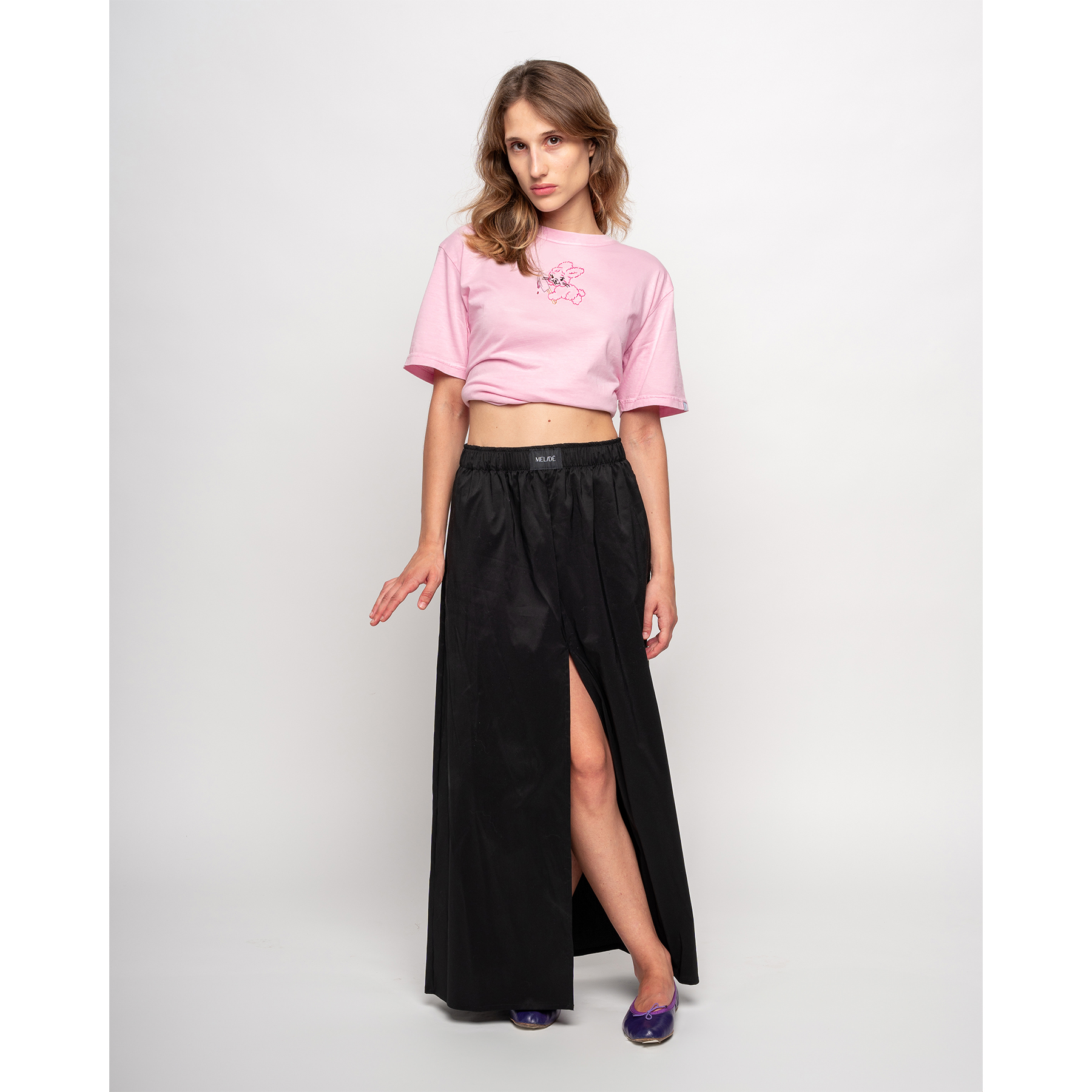 Gonna e camicia sono realizzate con lo stesso tessuto deadstock, un morbido mix di viscosa (97%) ed elastane (3%). Il completo non fa “troppo” né appesantisce: la viscosa è leggera e fluida, non crea volumi rigidi e cade morbida sul corpo. Per questo sono due capi perfetti se indossati insieme.