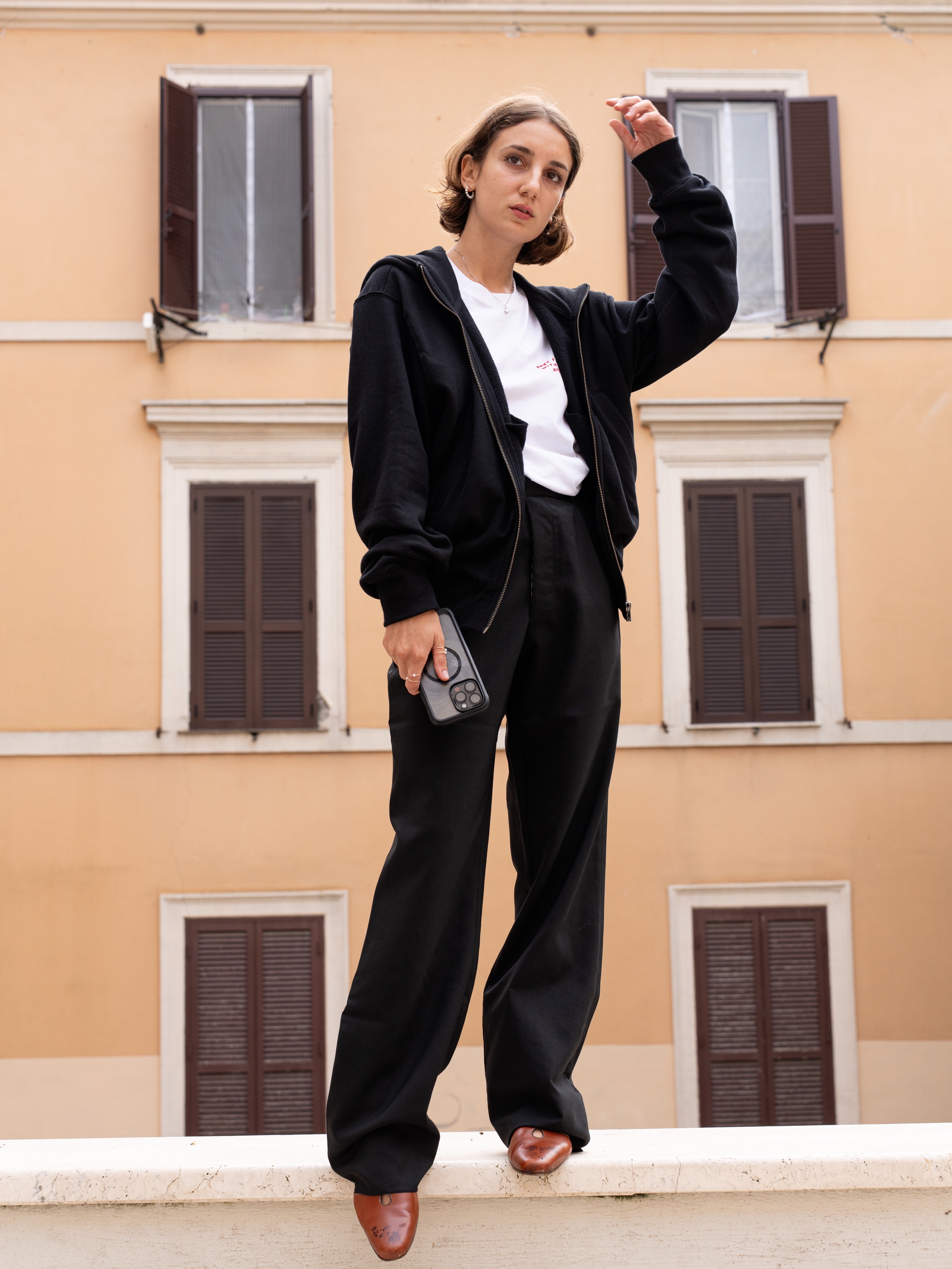 Giulia, davanti all’ex cinema Florida, Florid per gli amici, e sul muretto della fontana di Piazza Salvatore Fagiolo indossa la nuova felpa bomber in cotone caldo: la trovate sul sito in due versioni, con due ricami perfetti per questo capo, DO NOT DISTURB e un piccolo cuoricino bianco, entrambi ricamati a mano sulla schiena.