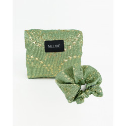 Beauty-case sartoriale realizzato in tessuto deadstock in kit con ruouche per capelli realizzata con lo stesso tessuto.