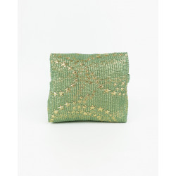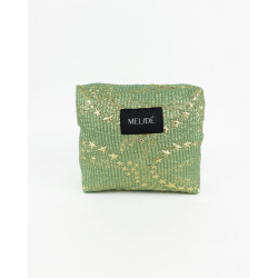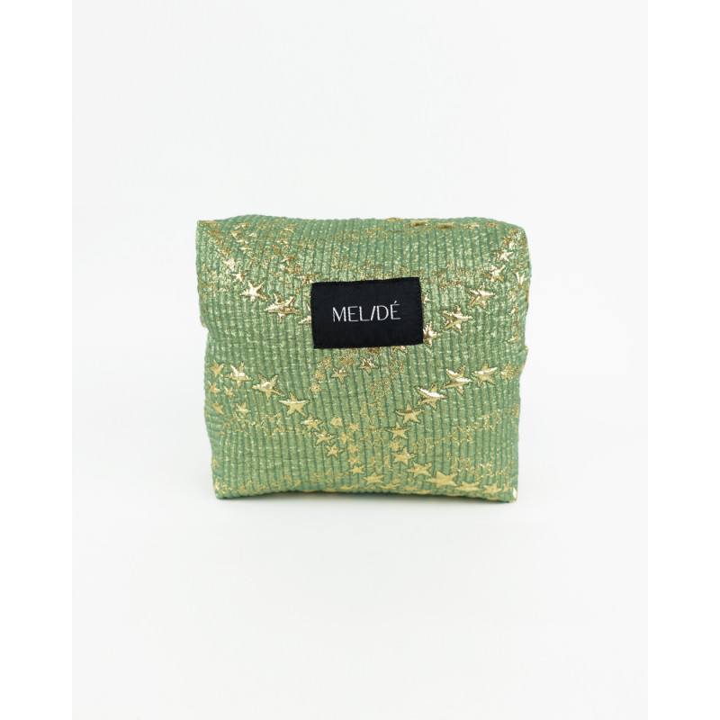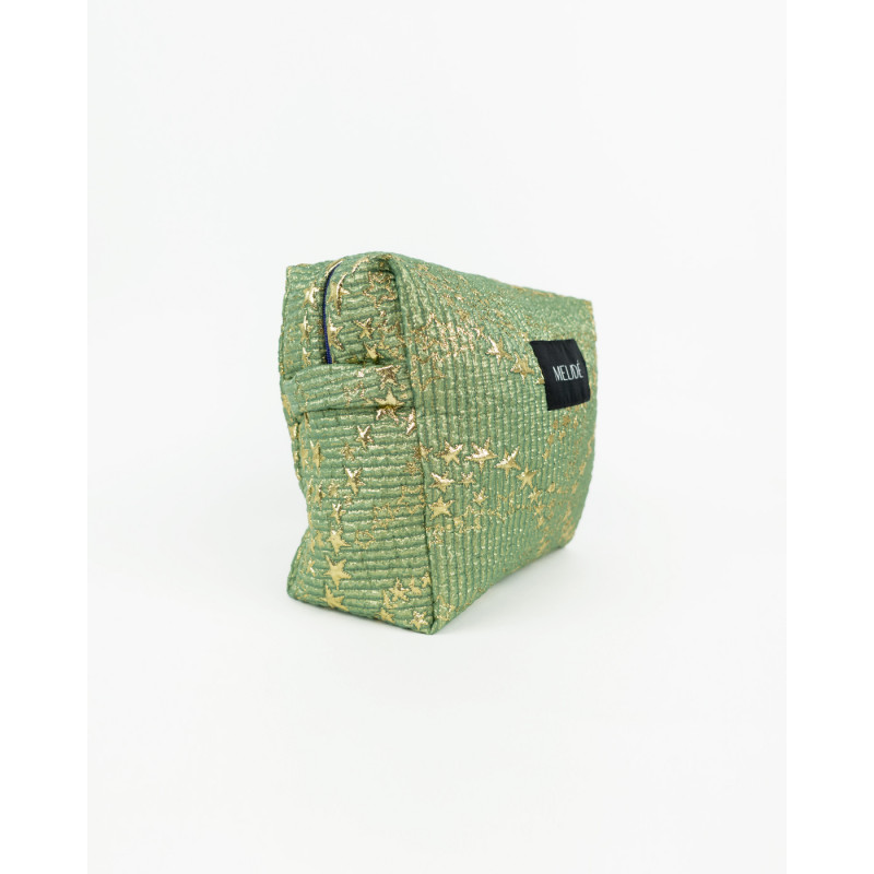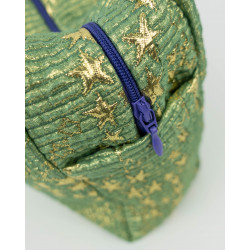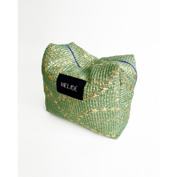 Beauty-case sartoriale in tessuto deadstock con dettagli metallizzati. Cerniera viola.