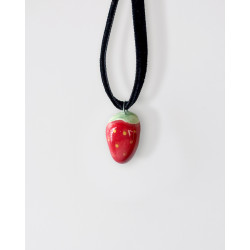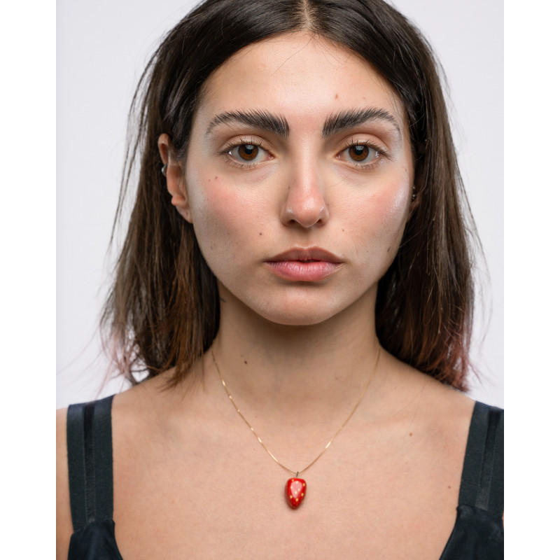 Rosso lucido, puntinata a mano e con fogliolina verde in cima: questa fragola in ceramica è un piccolo frutto da indossare. Dolce, pop e sempre di stagione.