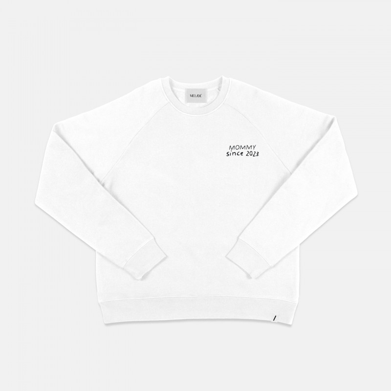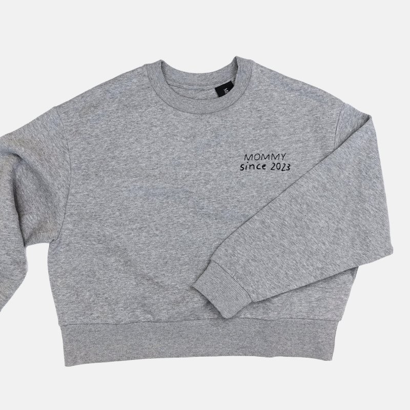 Felpa ricamata a mano nella factory melidé in cotone GOTS. In che anno la tua mamma è diventata mamma? Ricamalo su una t-shirt personalizzata appositamente per lei, sarà stra-felice di indossarla!