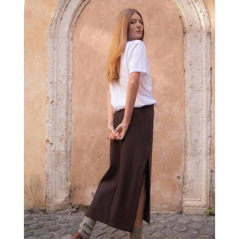 Gonna midi realizzata con due pannelli dal design asimmetrico. È caratterizzata da una chiusura con cerniera nascosta sul retro, vita a altezza media e pinces per una silhouette definita. Gli spacchi laterali completano il modello con dinamismo.