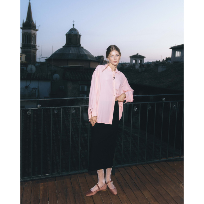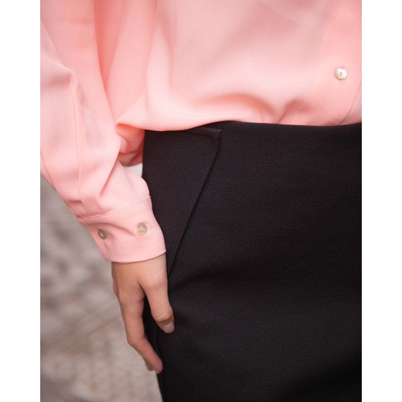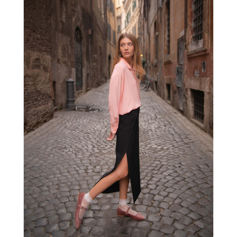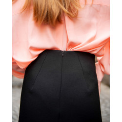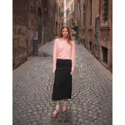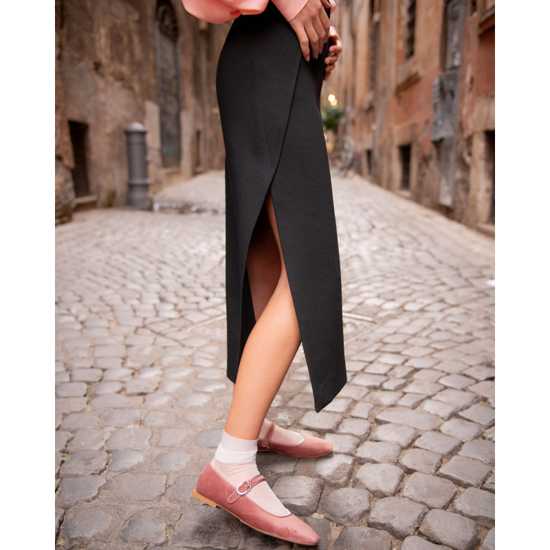 Gonna midi caratterizzata da un design a due pannelli asimmetrici. La chiusura è assicurata da una cerniera invisibile sul retro, mentre le pinces valorizzano la linea della vita, che si trova a un'altezza media. Completano il modello eleganti spacchi sui lati.