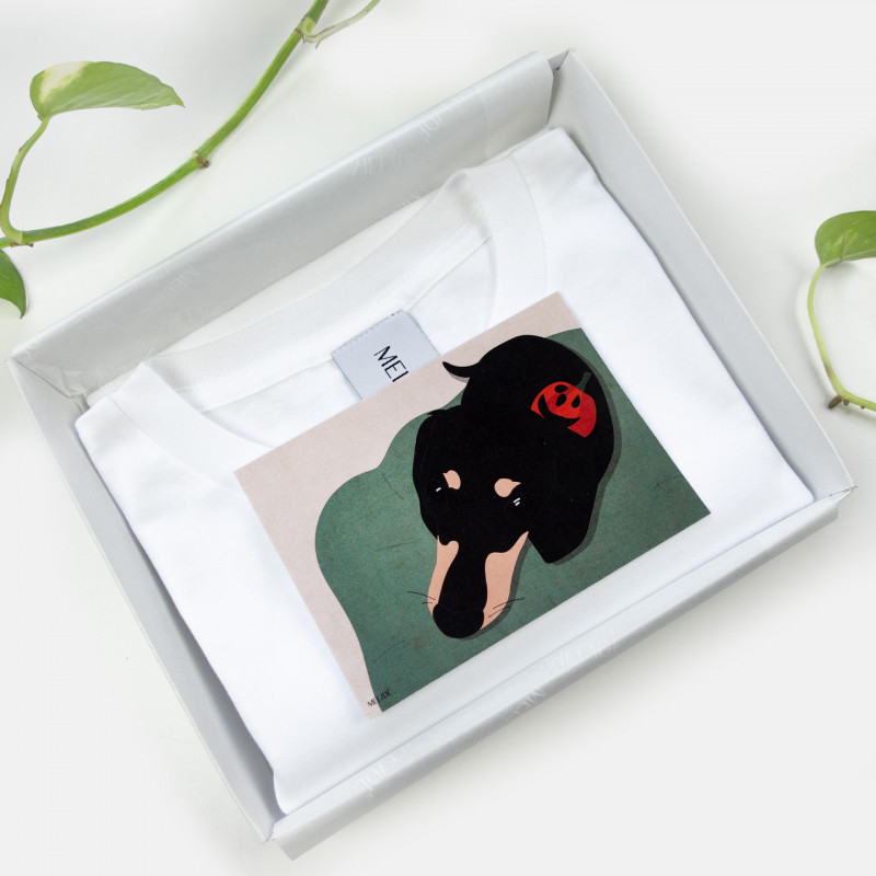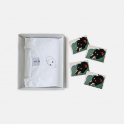 Questo kit è composto da una t-shirt personalizzata e un set di quattro stampe in formato A6 con la stessa illustrazione.