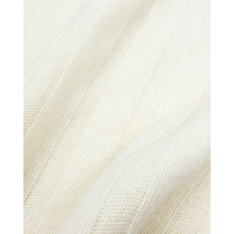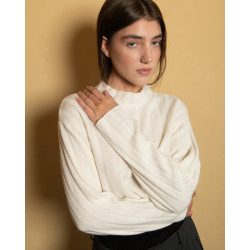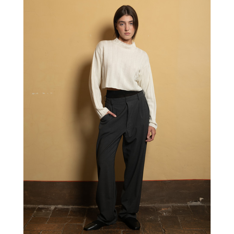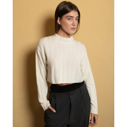 Maglione cropped variante panna, trama a coste larghe. Realizzato con filato di rimanenza in un maglificio di Prato.