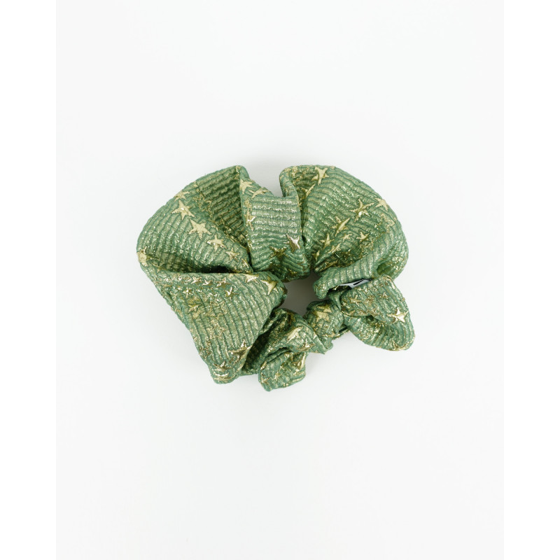 Accessorio per capelli sartoriale con tessuto proveniente da economia circolare. Base verde e dettagli stelline in filato metallizzato.