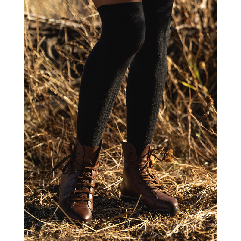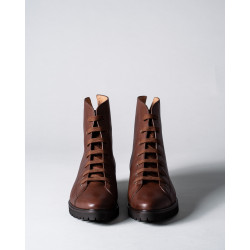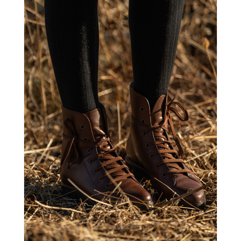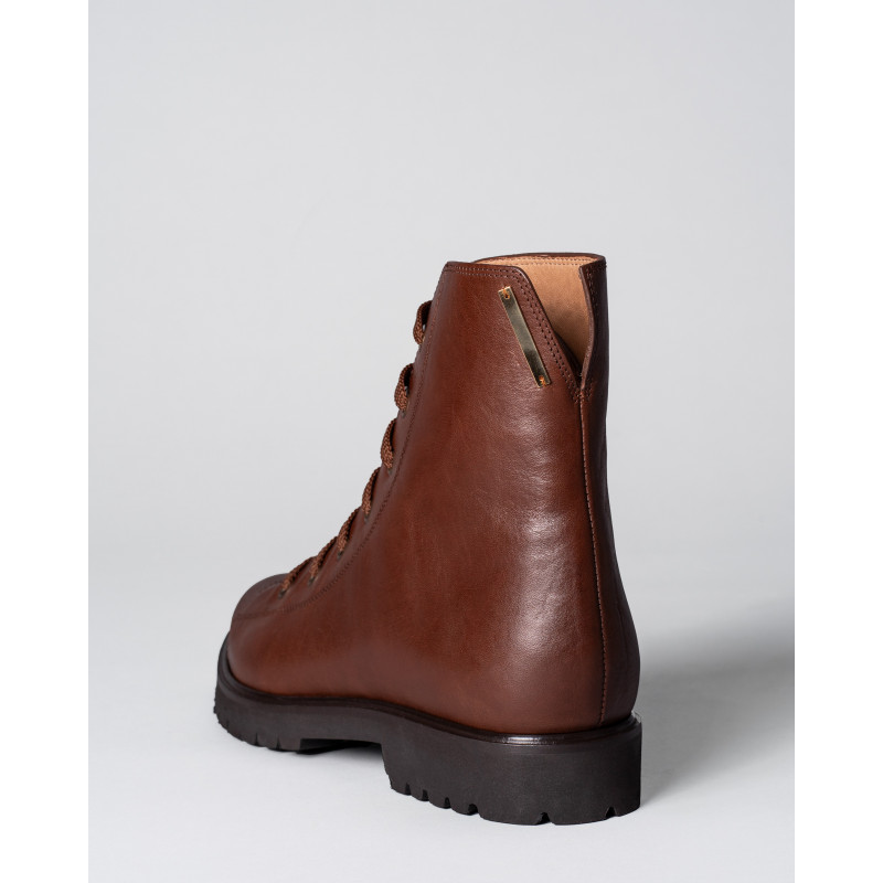 Le caratteristiche peculiari di questo esclusivo design MELIDÉ® sono la punta affusolata montata su una suola carro armato che conferisce uno stile raffinato a una scarpa adatta alla pioggia e alle lunghe camminate, l'elegante fodera color biscotto, lo spacco asimmetrico sul retro valorizzato da un dettaglio in ottone che richiama il logo del brand. Allacciatura con stringhe dello stesso colore della tomaia.