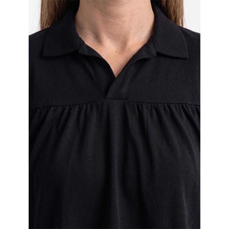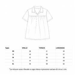 È strutturata in due parti: uno sprone piatto nella parte alta, dalla spalla al petto, e una sezione inferiore arricciata che amplia la silhouette dal petto in giù, conferendo volume al capo. Rifiniture delicate su tutti i bordi.