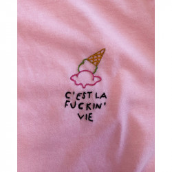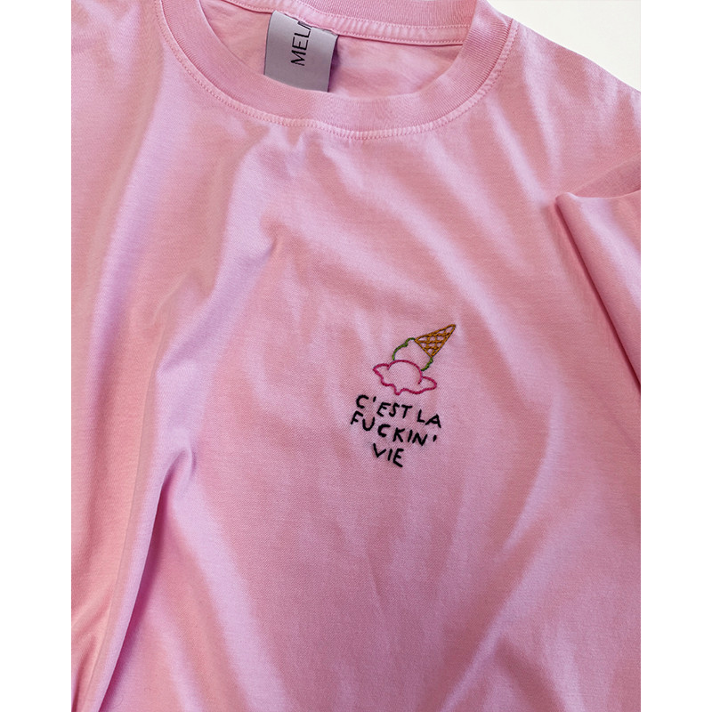 Il ricamo, realizzato a mano nella nostra factory Melidé, raffigura un gelato caduto e la scritta “C’est la fucking vie”.