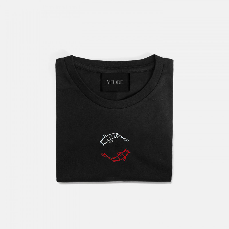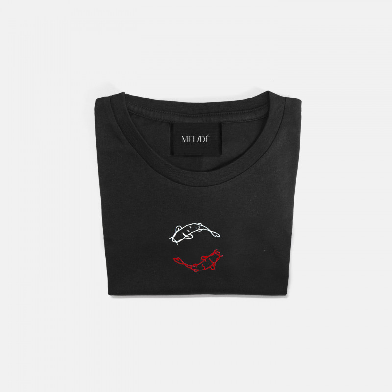 Le due carpe, una nera e una rossa a ricordare il simbolo dello Yin e dello Yang. In cinese, 有鱼 Yǒuyú, che significa “avere il pesce”, si pronuncia come 有余 Yǒuyú che vuol dire “avere abbondanza”. Le due carpe in questa posizione significano "avere fortuna e ricchezza".