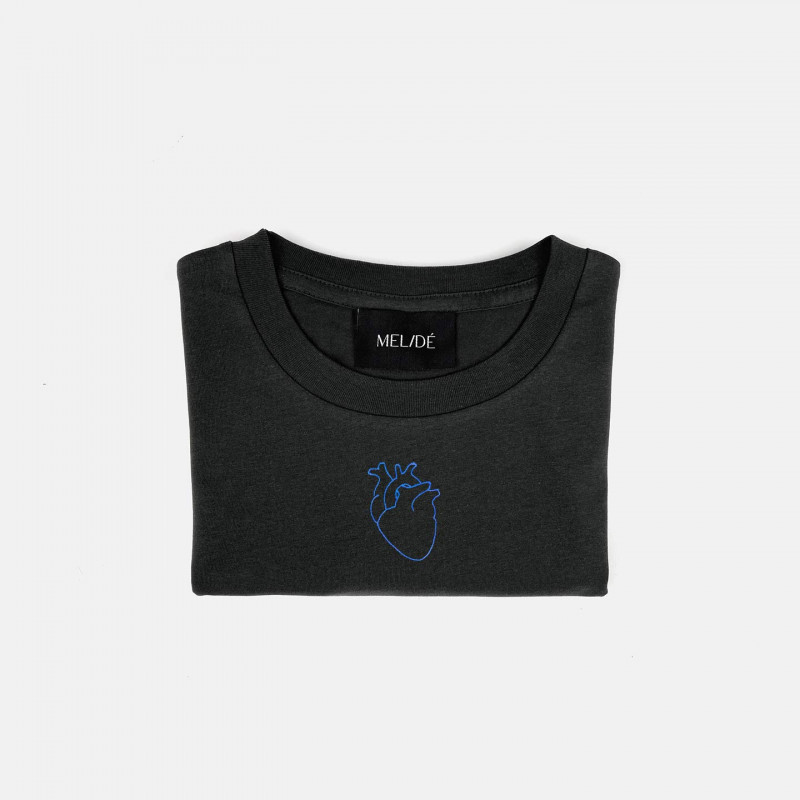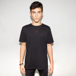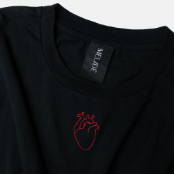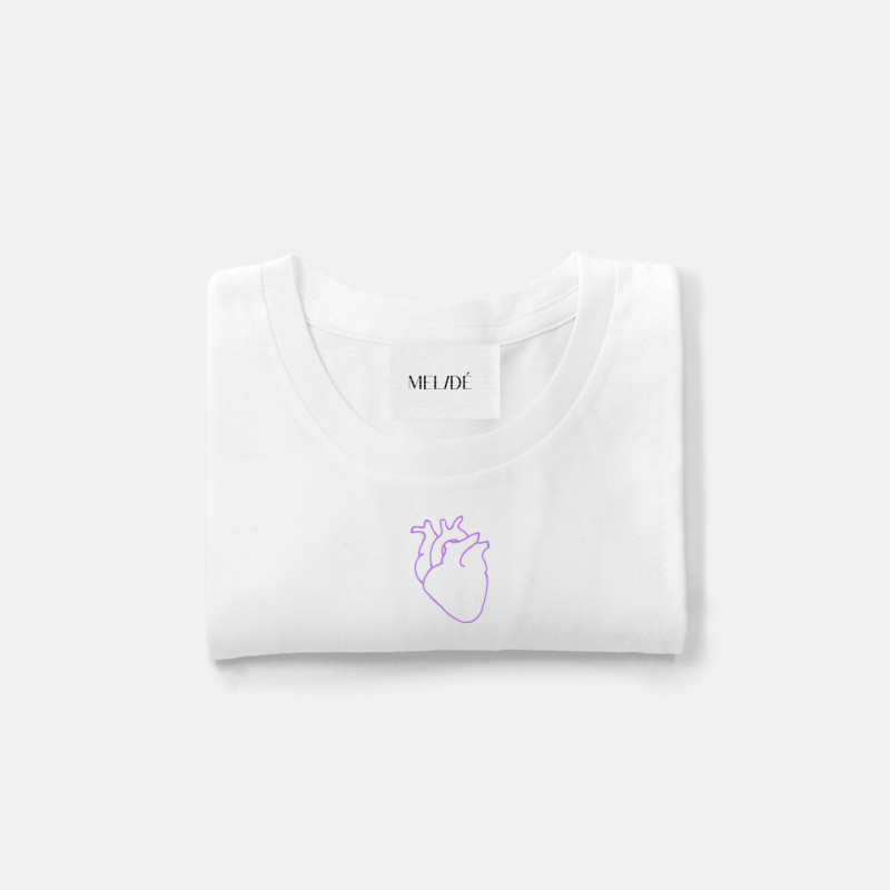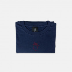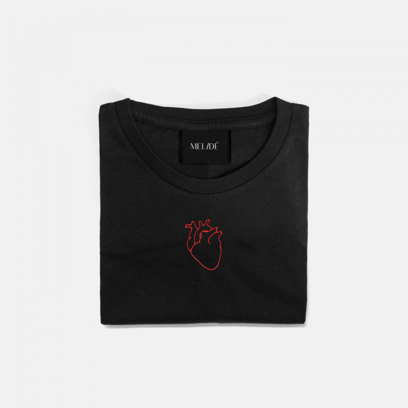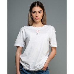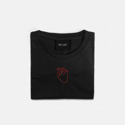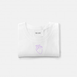 T-shirt in cotone biologico modello lineheart o cuore anatomico, ricamata a mano su cotone sostenibile di alta qualità.