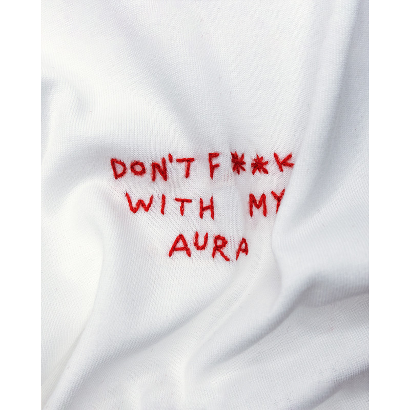 Su TikTok c’è da tempo il trend degli #aurapoints: bonus o malus invisibili che accumuli a ogni gesto, dal caffè nella tazza giusta al messaggio all’ex. Un pezzo del Guardian del 2024 spiegava che questo modo di misurare la figaggine parla la lingua di Aristotele: eudaimonia non è uno stato ma una pratica, non il picco del “mi sento bene”, bensì un processo in cui, mentre sbagliamo e ricalibriamo, allineiamo valori e azioni finché la vita, poco alla volta, ci somiglia. Il lato B? Quella che Alain de Botton chiama “ansia di status”: l’eco di ciò che gli altri pensano di noi, antica e super tiktokiana. La nostra versione del trend è una T-shirt bianca con ricamo rosso (combo che amiamo), appena sfornata per la stagione blazer + tee.