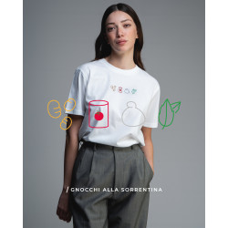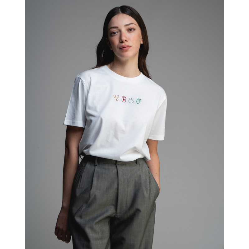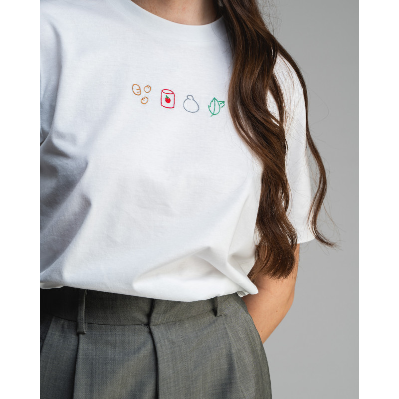 Collezione PASTA realizzata su t-shirt ricamata a mano nella factory melidé in cotone GOTS.