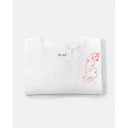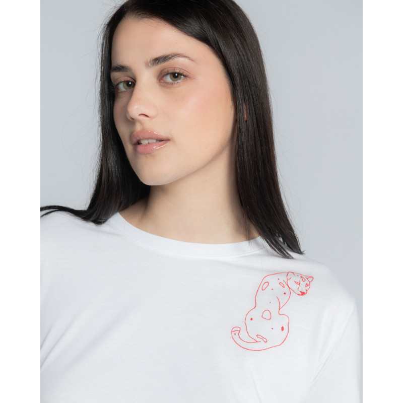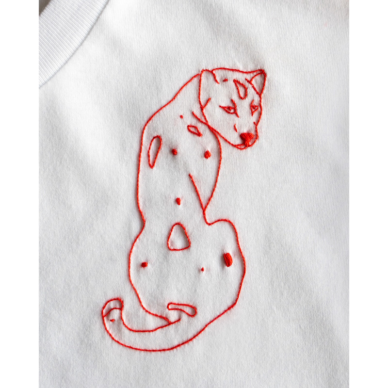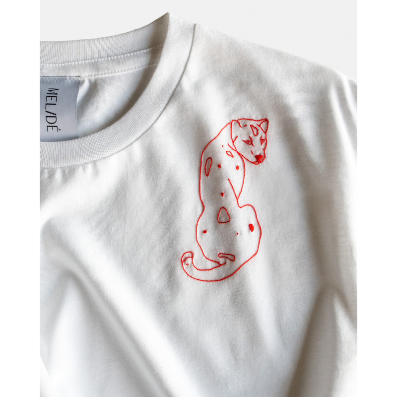 T-shirt con ricamo artigianale raffigurante un leopardo stilizzato in filo rosso, posizionato sul lato sinistro del petto. Il design è essenziale, quasi un profilo che sottolinea la silhouette dell’animale e ne evidenzia lo sguardo deciso. Il contrasto tra il candore del tessuto e il ricamo vivace risalta subito all’occhio, creando un effetto raffinato e minimal.
