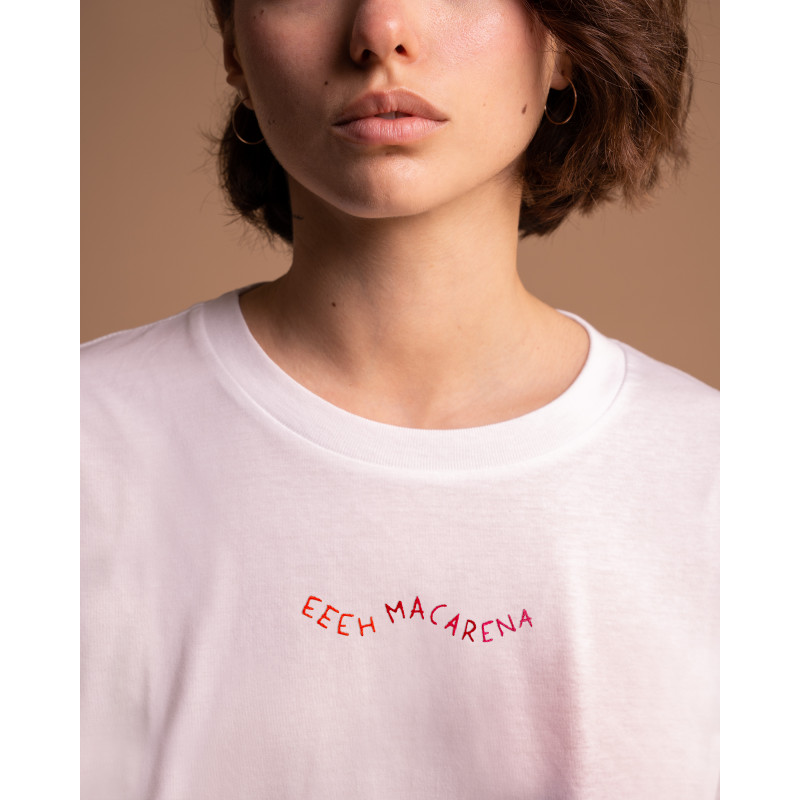 Ma lo sapevi che Macarena è il nome di una ragazza e non una parola a caso? Noi l'abbiamo scoperto quando abbiamo deciso di ricamare questa t-shirt. Riesci al leggerla senza intonare la canzone? Impossibile.