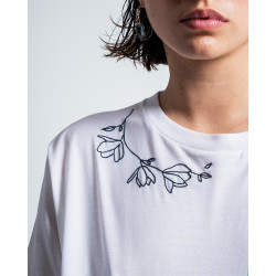 Una magnolia ricamata a mano su T-shirt in cotone GOTS.