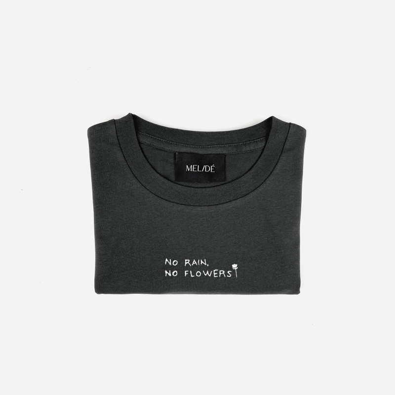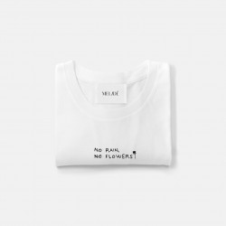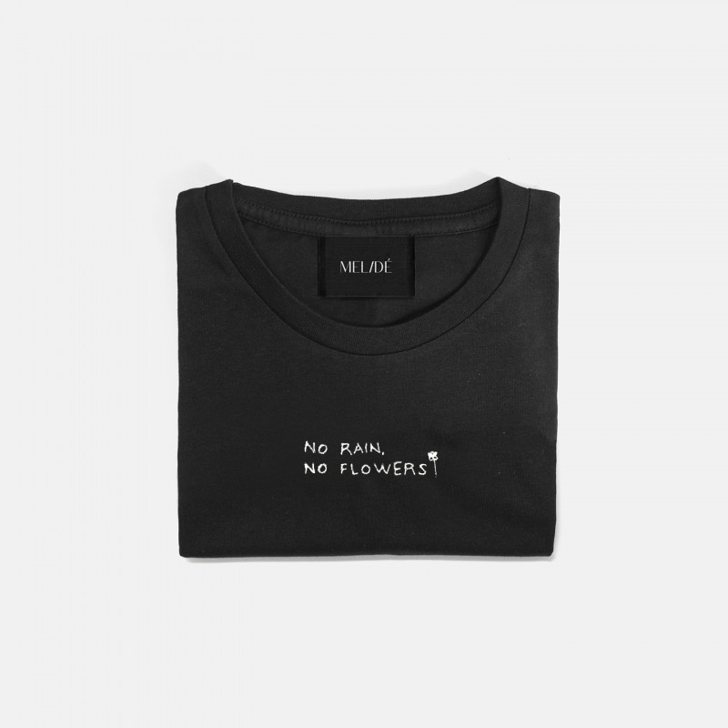 T-shirt in cotone bio certificato disponibile in più modelli e colori. Ricamo No rain, no flowers realizzato a mano nella factory melidé. Made in Italy.