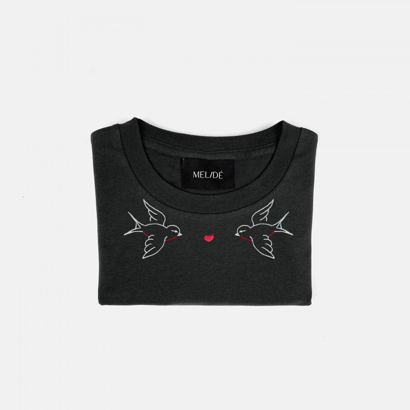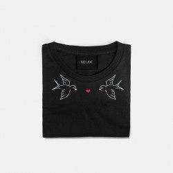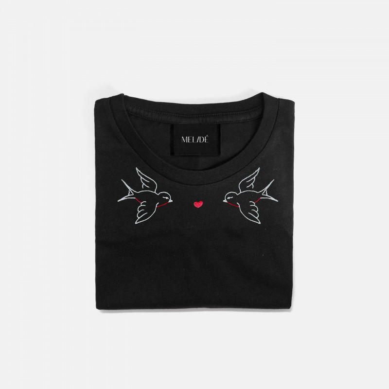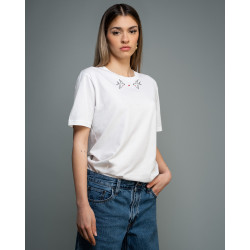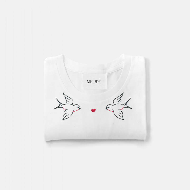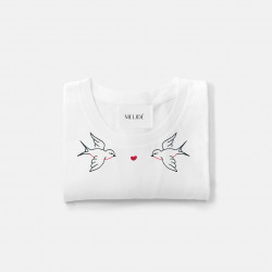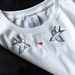 Ricamo realizzato a mano su t-shirt in morbido cotone biologico di alta qualità, certificato.