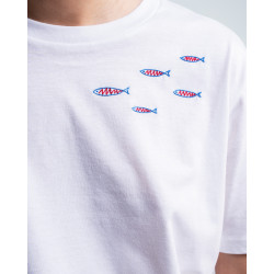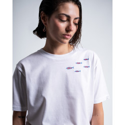 Un delicato ricamo di pesci eseguito a mano su una T-shirt 100% cotone GOTS.