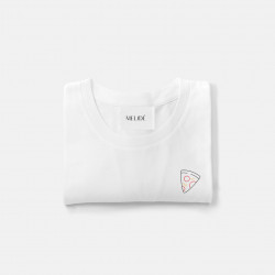 Ricamo realizzato a mano nella nostra factory su cotone biologico di alta qualità, modello pizza.