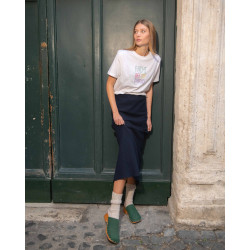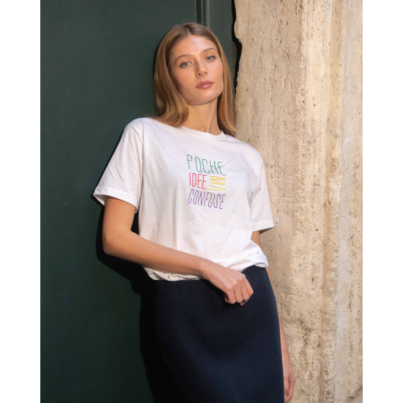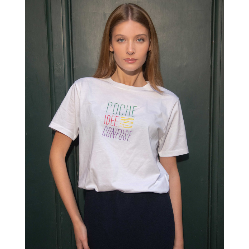 Ricamo realizzato a mano su cotone sostenibile e certificato di alta qualità in collaborazione con Santomanifesto.