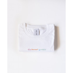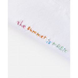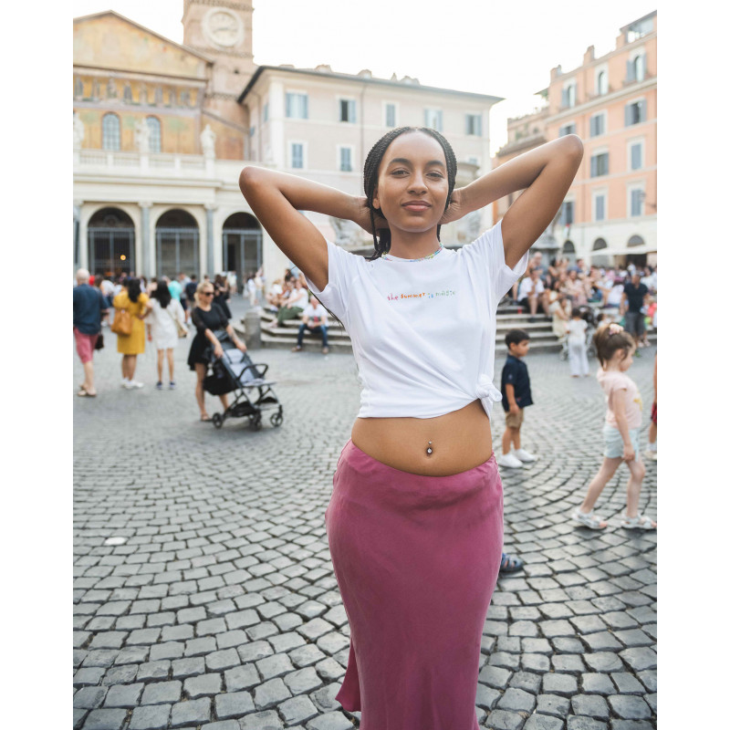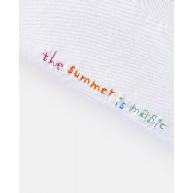 T-shirt ricamata a mano nella factory melidé con ricamo ispirato alla canzone "Summer is magic" del gruppo eurodance italiano Playahitty. Nel momento in cui l'estate sta finendo, "Summer is magic" riporta alla mente i ricordi delle vacanze anni '90 in Italia meglio di quanto qualsiasi album fotografico potrebbe mai fare.