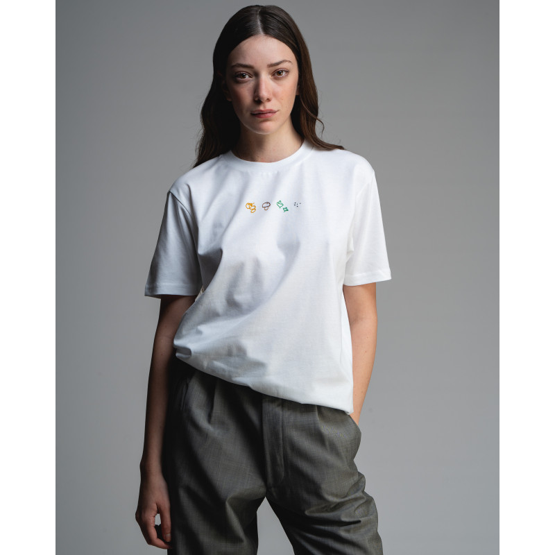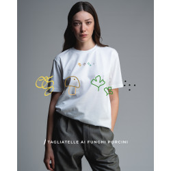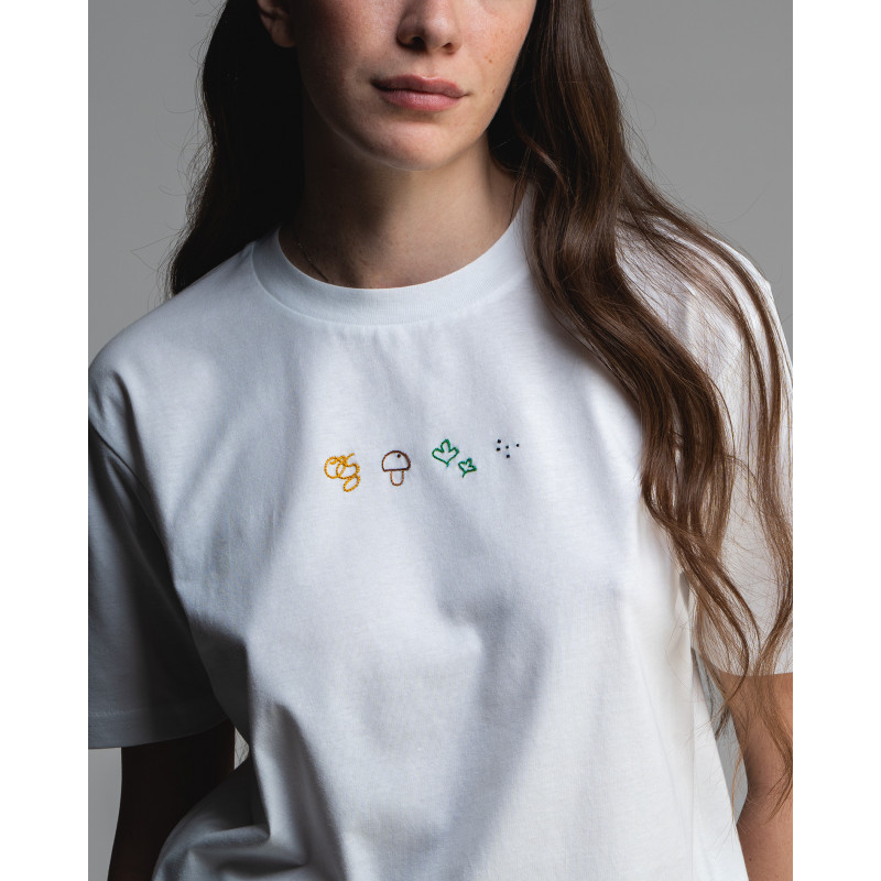 Collezione PASTA realizzata su t-shirt ricamata a mano nella factory melidé in cotone GOTS.