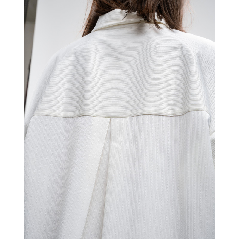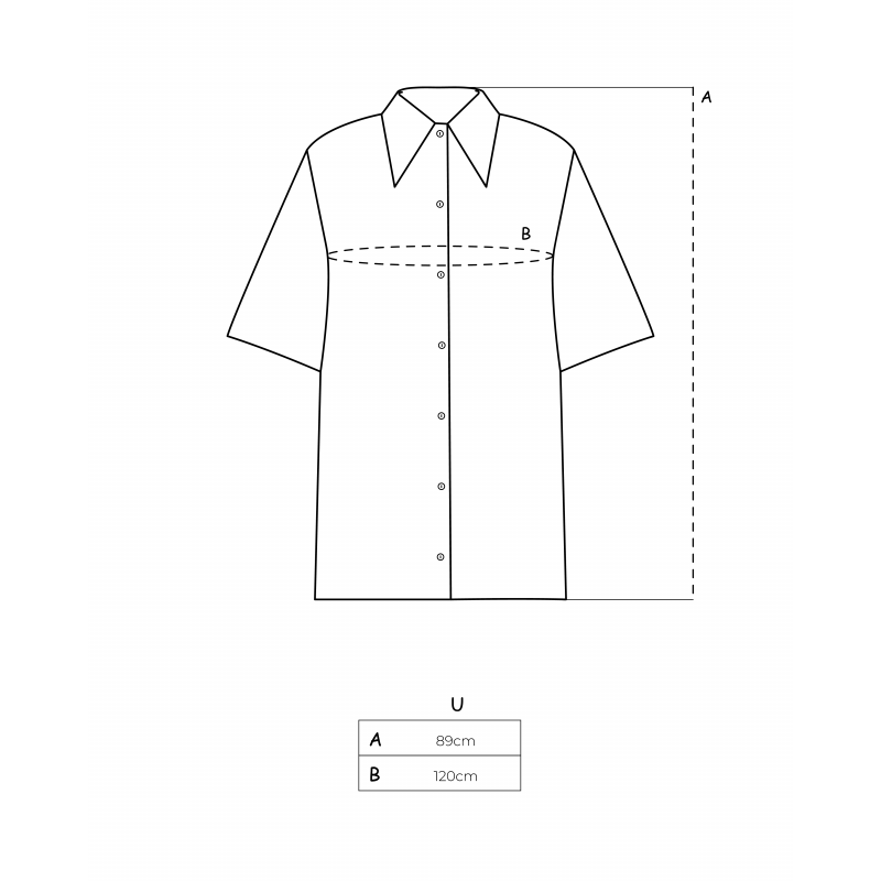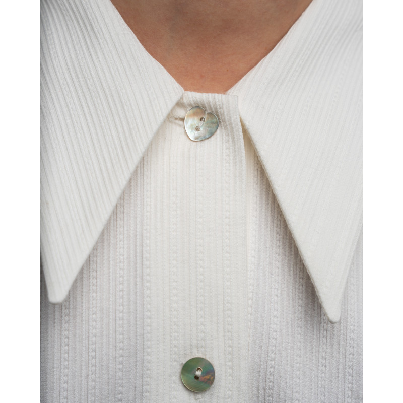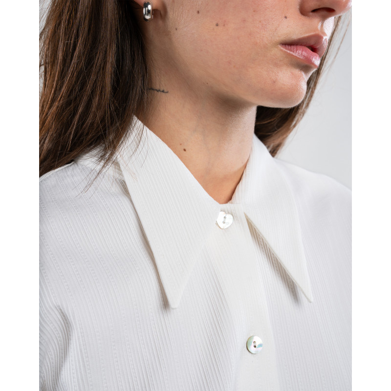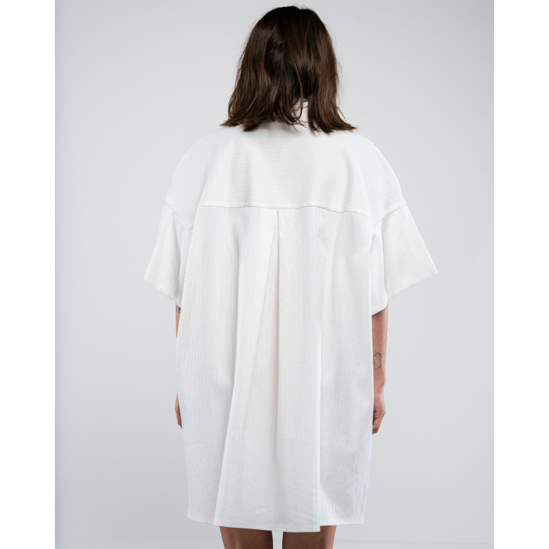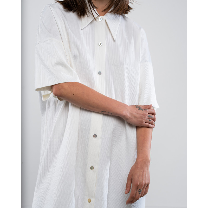 Un’interpretazione minimalista del classico chemisier, pensata per chi ama le linee pulite e i volumi generosi. Realizzato in cotone goffrato bianco latte, proveniente da economia circolare, questo vestito camicia ha una silhouette dritta e rilassata, maniche corte ampie e un colletto a punta pronunciato. La chiusura frontale con bottoni madreperlanaturale ne enfatizza l’eleganza essenziale. Il primo bottone è a forma di fiore.