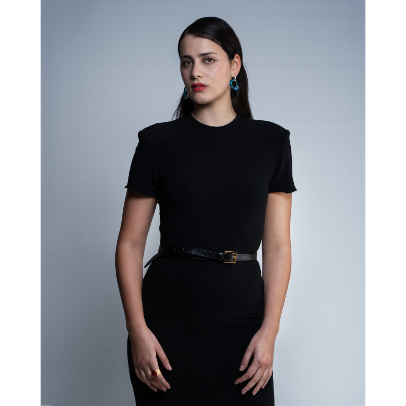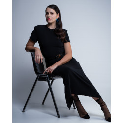 Vestito tubino lunghezza midi a maniche corte, nero in jersey di poliestere riciclato (certificato GRS - Global Recycled Standard), lunghezza midi, orlo a birillo, scollo stretto in stile T-shirt e spalline foderate in viscosa. Ideale per creare look diversi giocando con le sovrapposizioni. Oppure indossalo da solo per ottenere uno stile elegante e austero e allo stesso tempo easy.