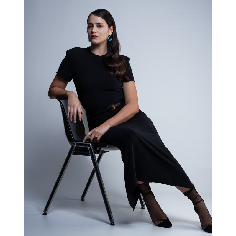 Abito tubino midi sartoriale con spalline imbottite in poliestere riciclato certificato GRS.