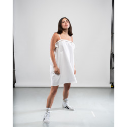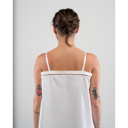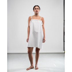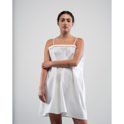 Vestito ampio in cotone e seta da economia circolare, con spalline in raso e bordo con scaletta decorativa.