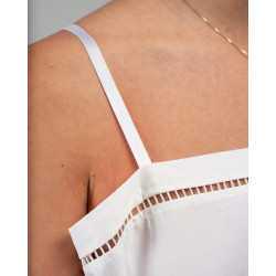 Il bordo superiore è rifinito con una scaletta — un dettaglio sartoriale sobrio ma distintivo — mentre le spalline in raso aggiungono un tocco lucido e leggero.