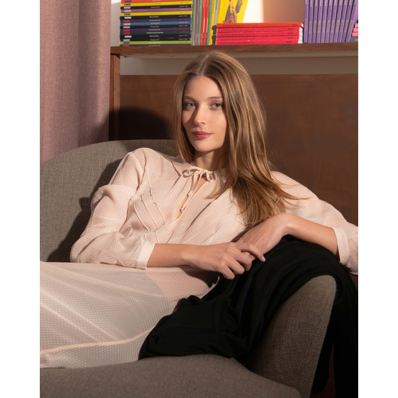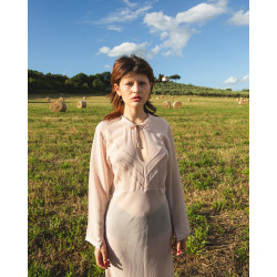 Colletto con laccio nel medesimo tessuto e scollo a goccia.