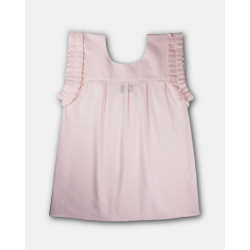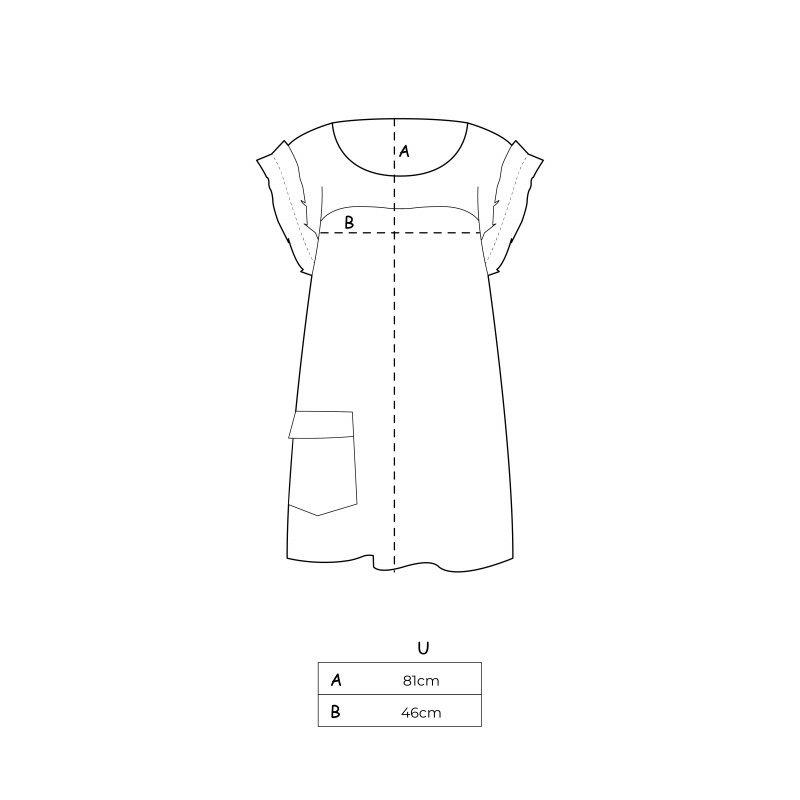 La linea dritta è valorizzata da bordi con rouches tono su tono che ne seguono il profilo, donando movimento e delicatezza.